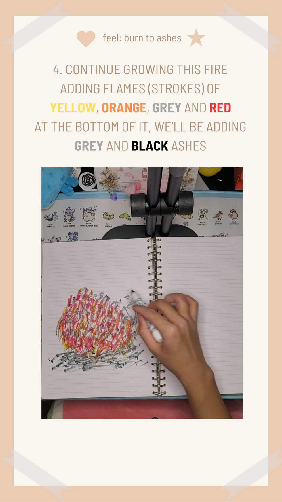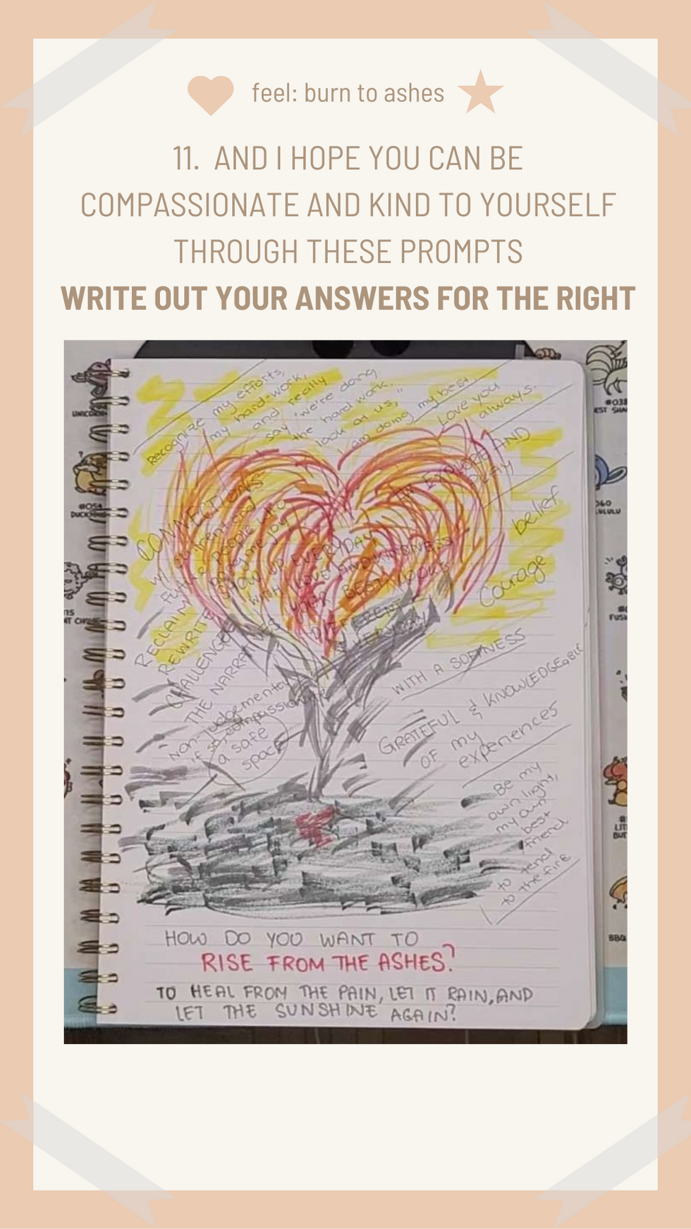 And with that, you have a narrative and visual reflection on things you actively work towards burning to ashes (letting go of) and then rise from the ashes (through healing and inviting better things).
