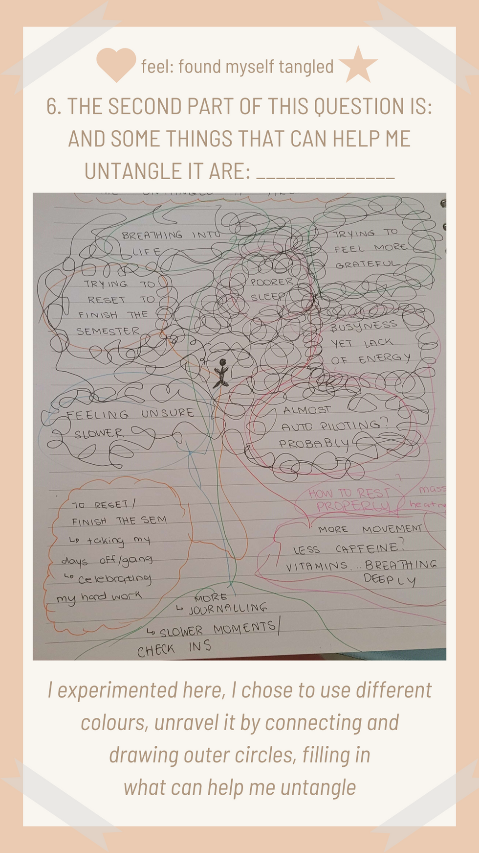 after writing your answers, start drawing scribbles, circles, spirals, all around these spaces that make you feel tangled